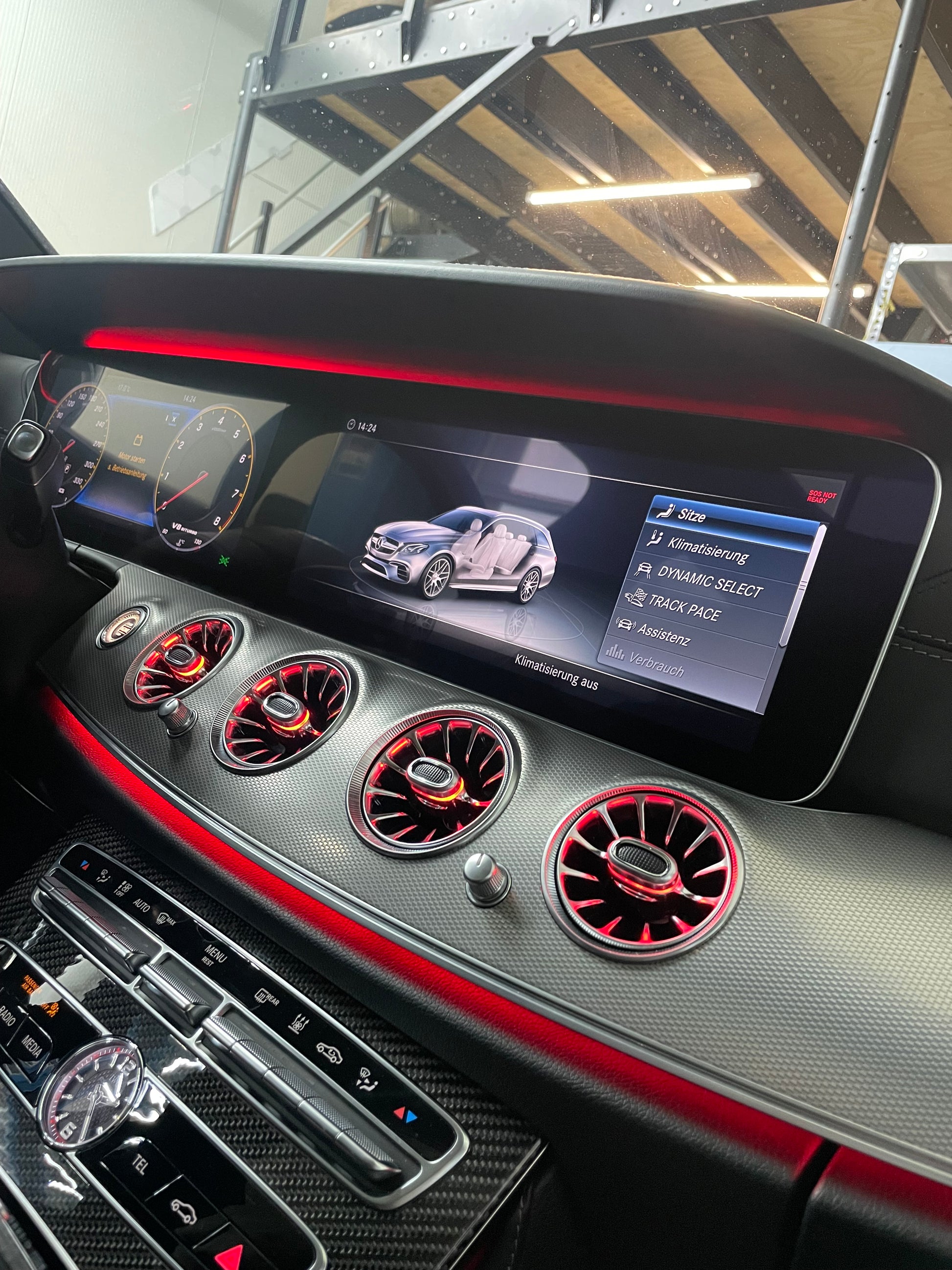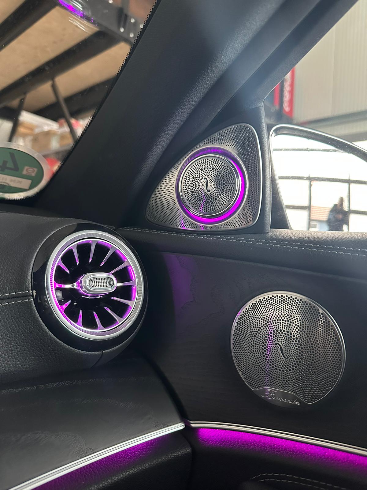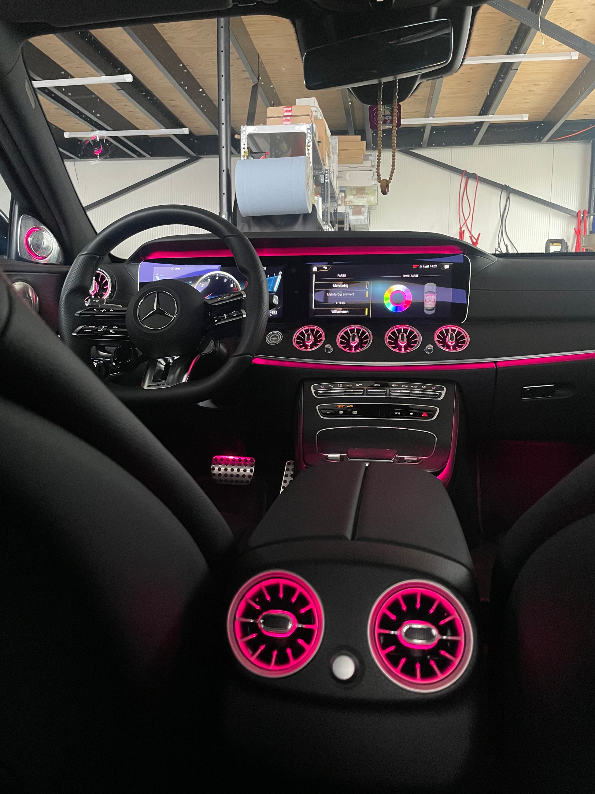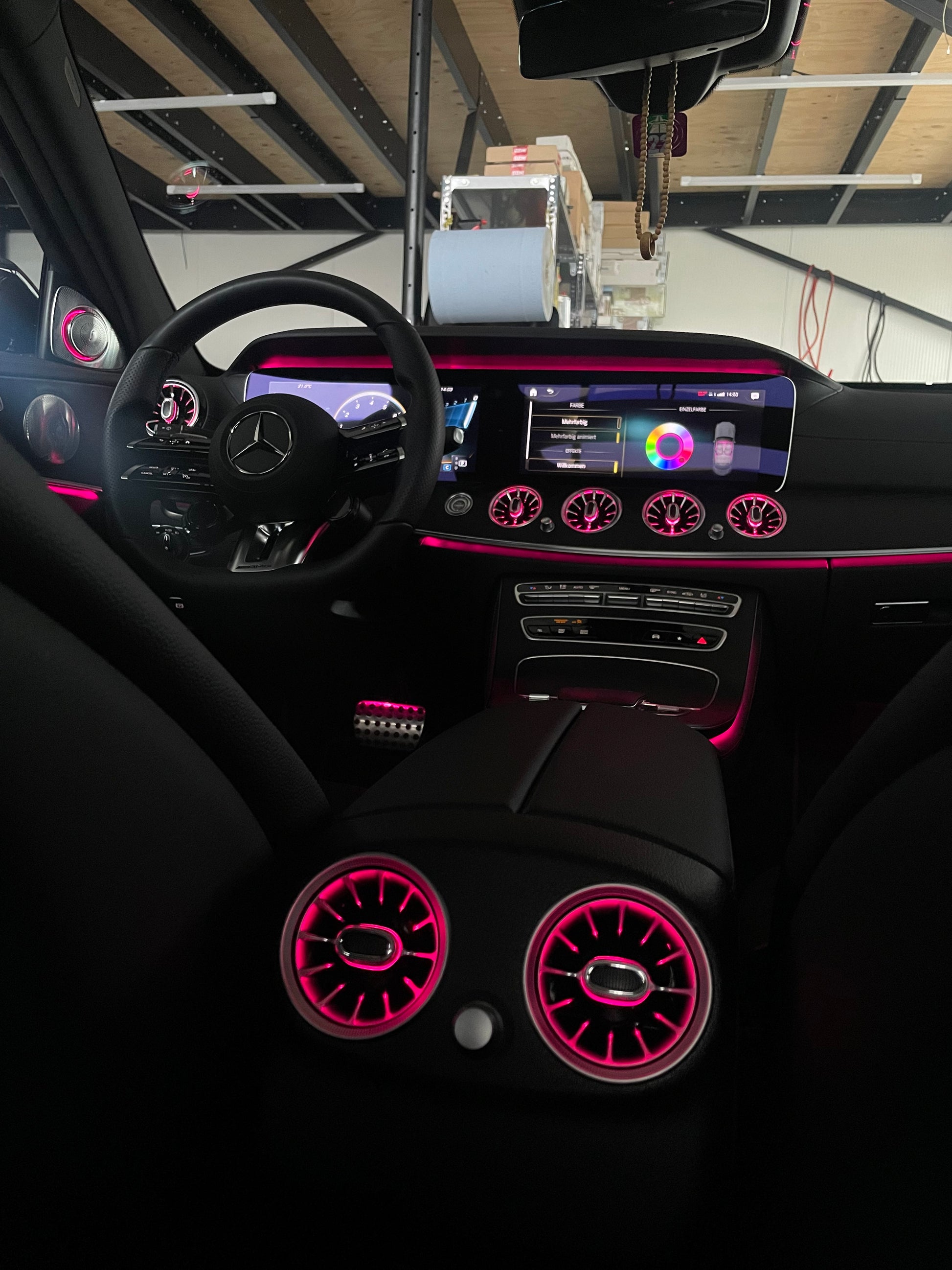The Mercedes Benz E-Class offers an impressive ambience with a choice of 64 colors. This wide range of color options allows you to customize the interior lighting to your personal preferences and create an atmosphere that suits your mood and driving experience. Additionally, enjoy the Galaxy View with our Air vents and 3D Burmester that reflects your personal style.